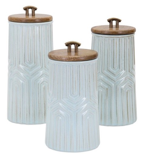 Set Of 3 Light Blue Ceramic Canisters With Wood Lid Wilford