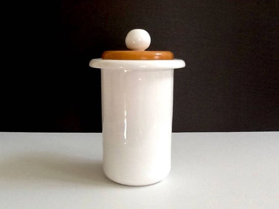Vintage Tall White Ceramic Canister Wood Lid With White Round Etsy