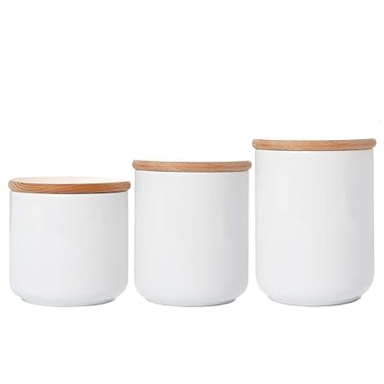 3 Piece Ceramic Kitchen Canisters Set With Wood Lid Porcelain