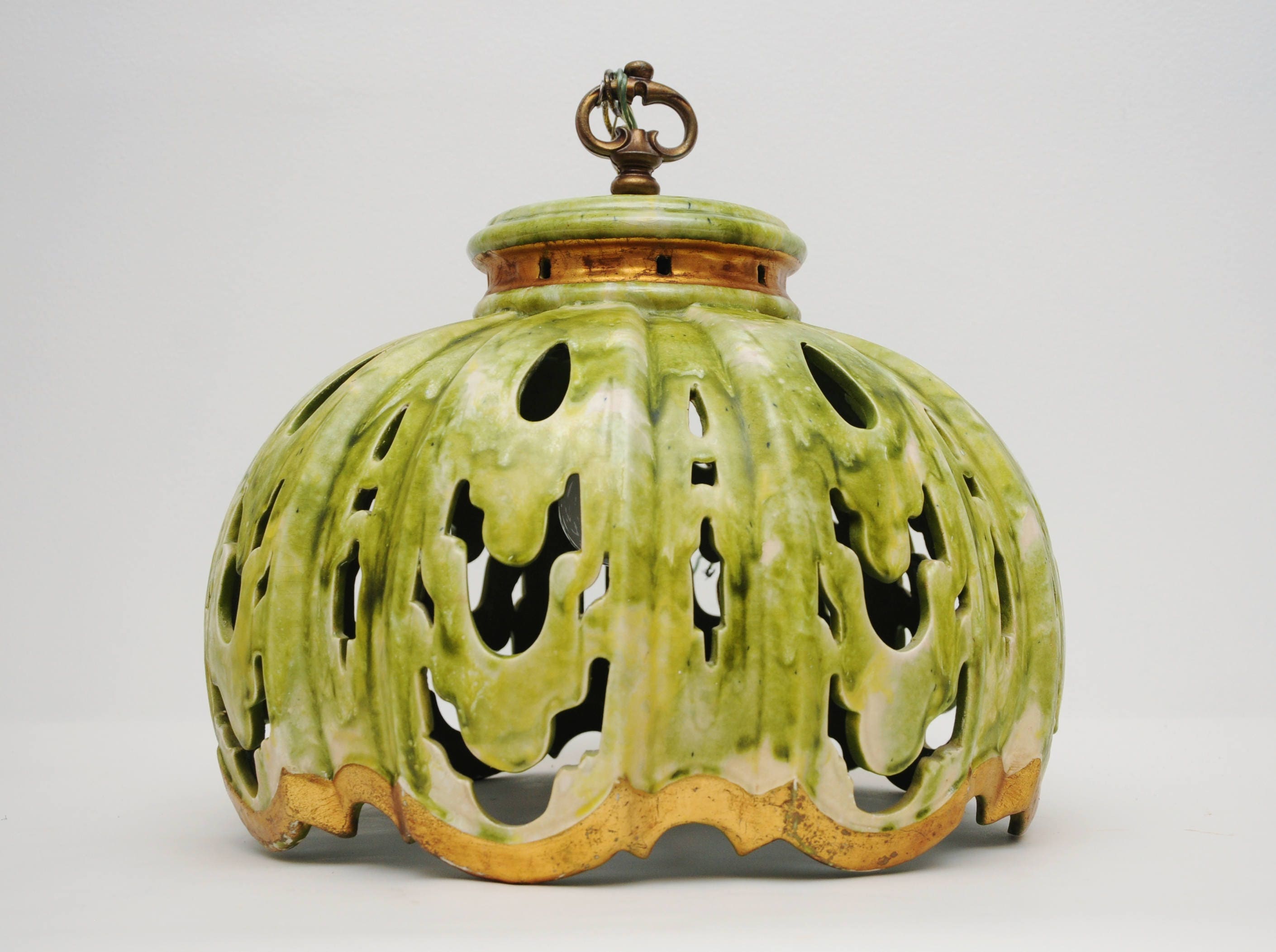 Large Mid Century Ceramic Cutout Swag Lamp Green Gold Vtg Etsy