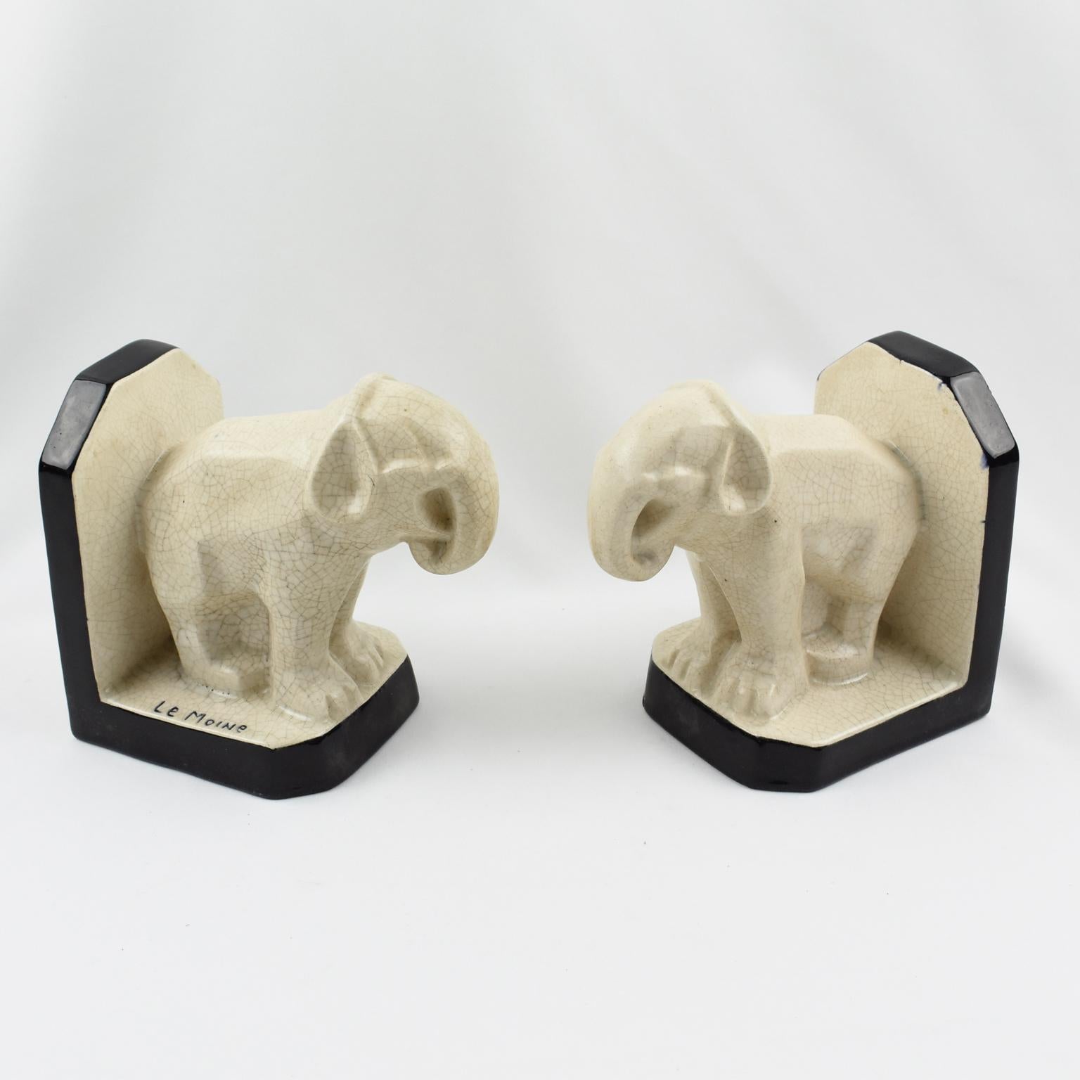 French Art Deco Crackle Ceramic Elephant Sculpture Bookends By Le