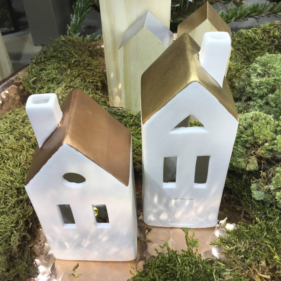 Small Ceramic Houses With Lights And Cedar Branches By Sandra