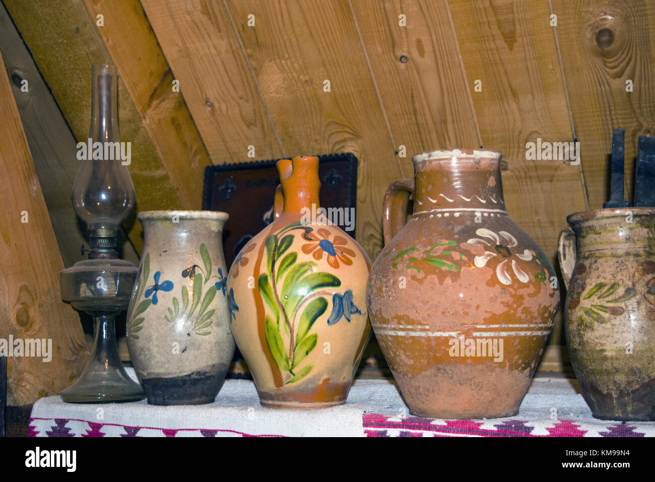 Ceramic Pitcher Jugs And An Old Oil Lamp Used By Peasants In Stock