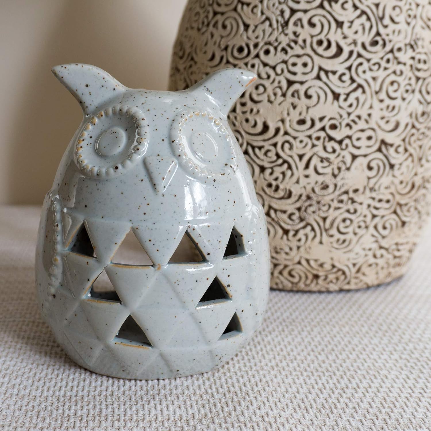 Ceramic Owl Tea Light Candle Holder 13cm Rustic Home Shelf