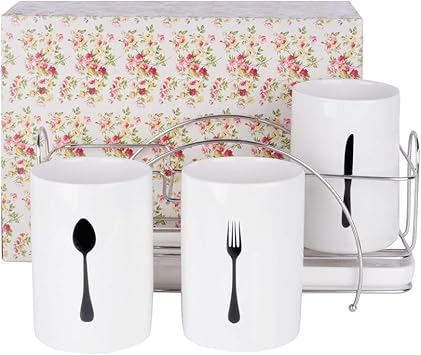 Szuah Ceramic Cutlery Caddy Crock Flatware Holder Organizer Set