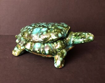 Vintage Arnel S Green Turtle Ceramic Glazed Trinket Jewelry Box