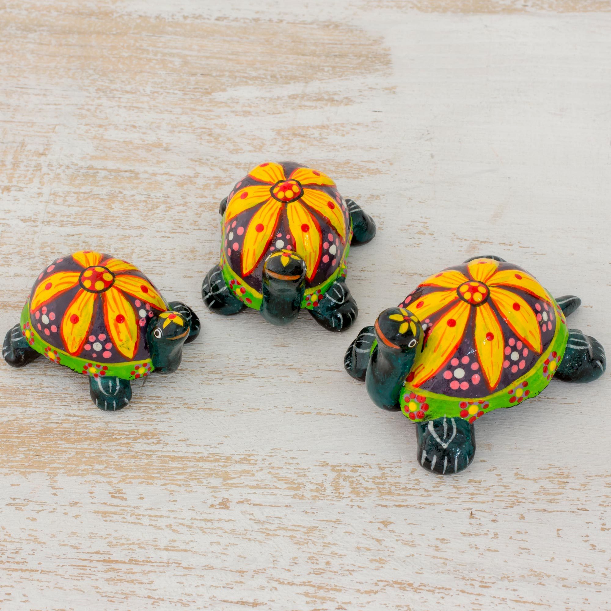 3 Handmade Ceramic Turtle Figurines With Floral Shells Yellow