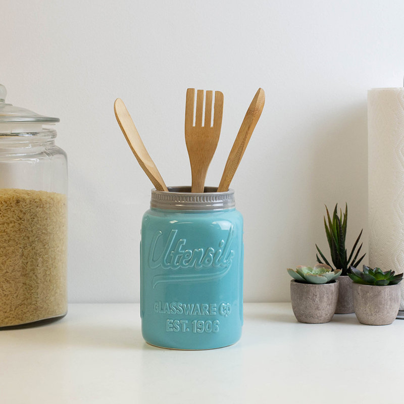 Mason Jar Aqua Blue Palais Essentials Ceramic Utensil Crock