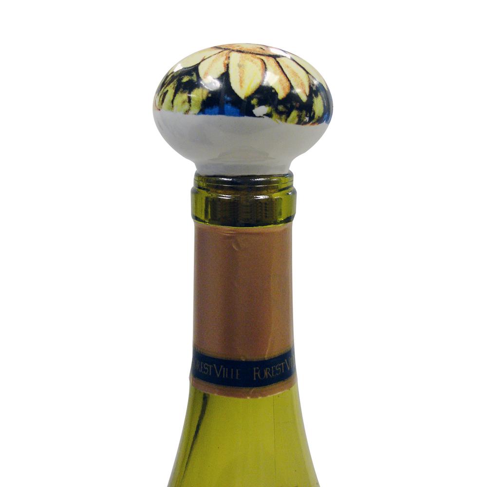 Ceramic Wine Stopper With Cork In Sunflower Pattern On A Blue