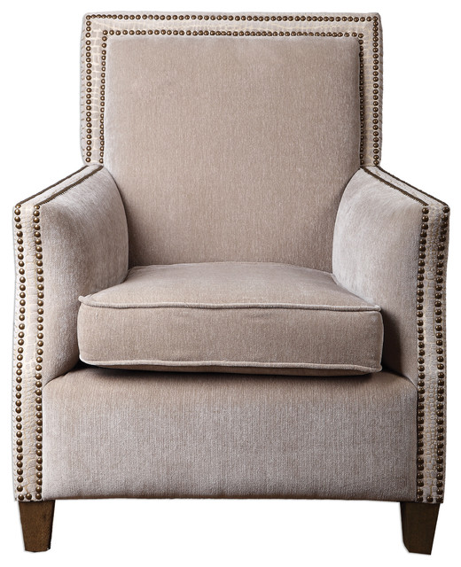 Contemporary Beige Neutral Arm Club Chair Nailhead Trim Luxe Faux