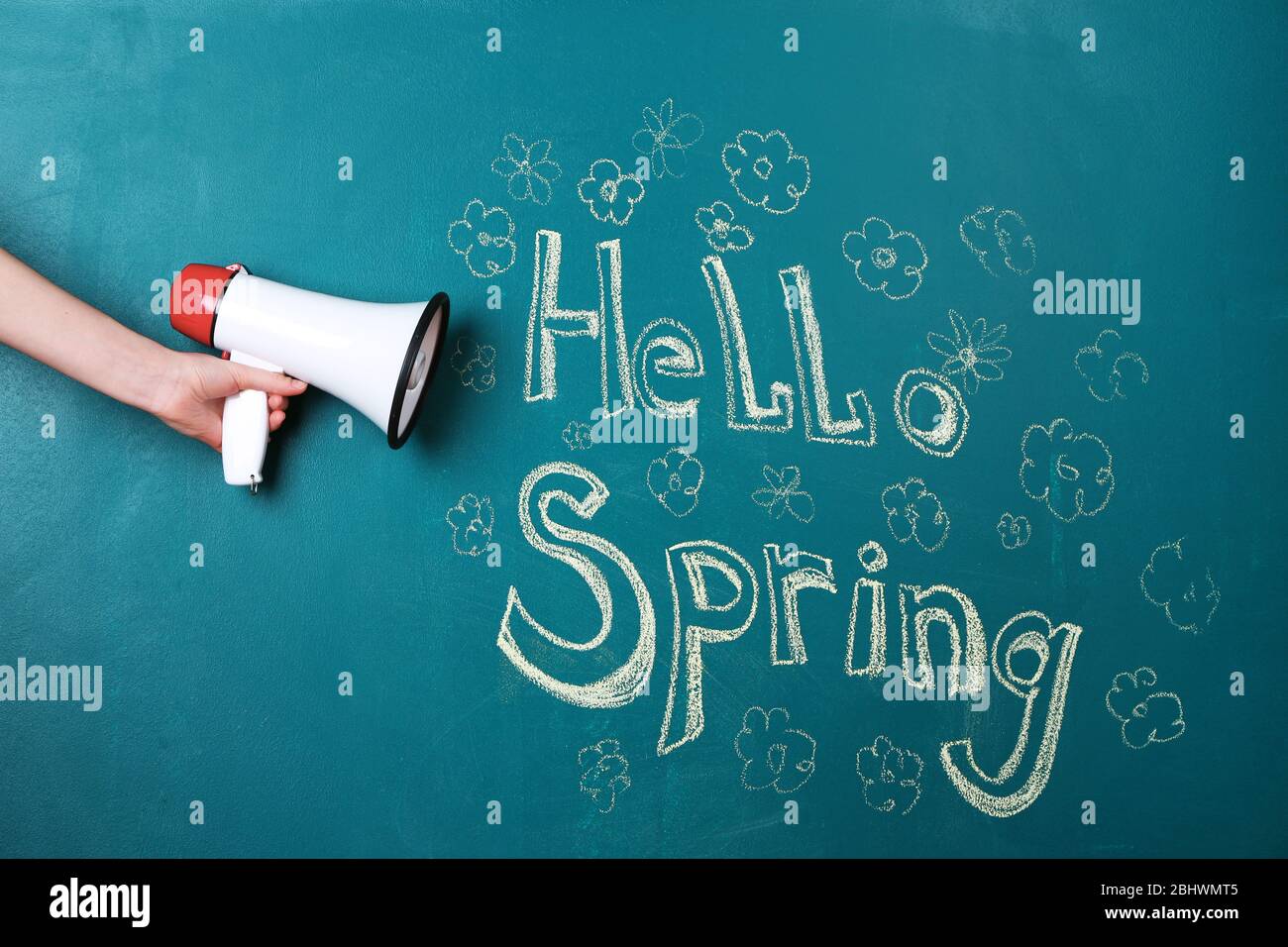 Holding Flowers On Blackboard Hand High Resolution Stock