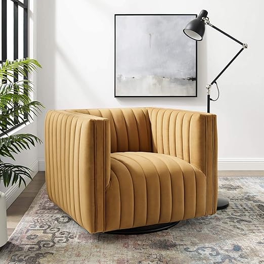 Yellow Mustard Cognac Velvet Vertical Channel Tufted Swivel Chair