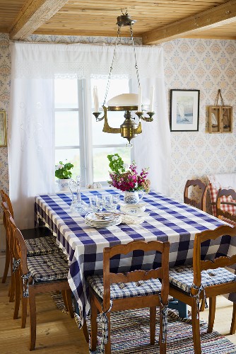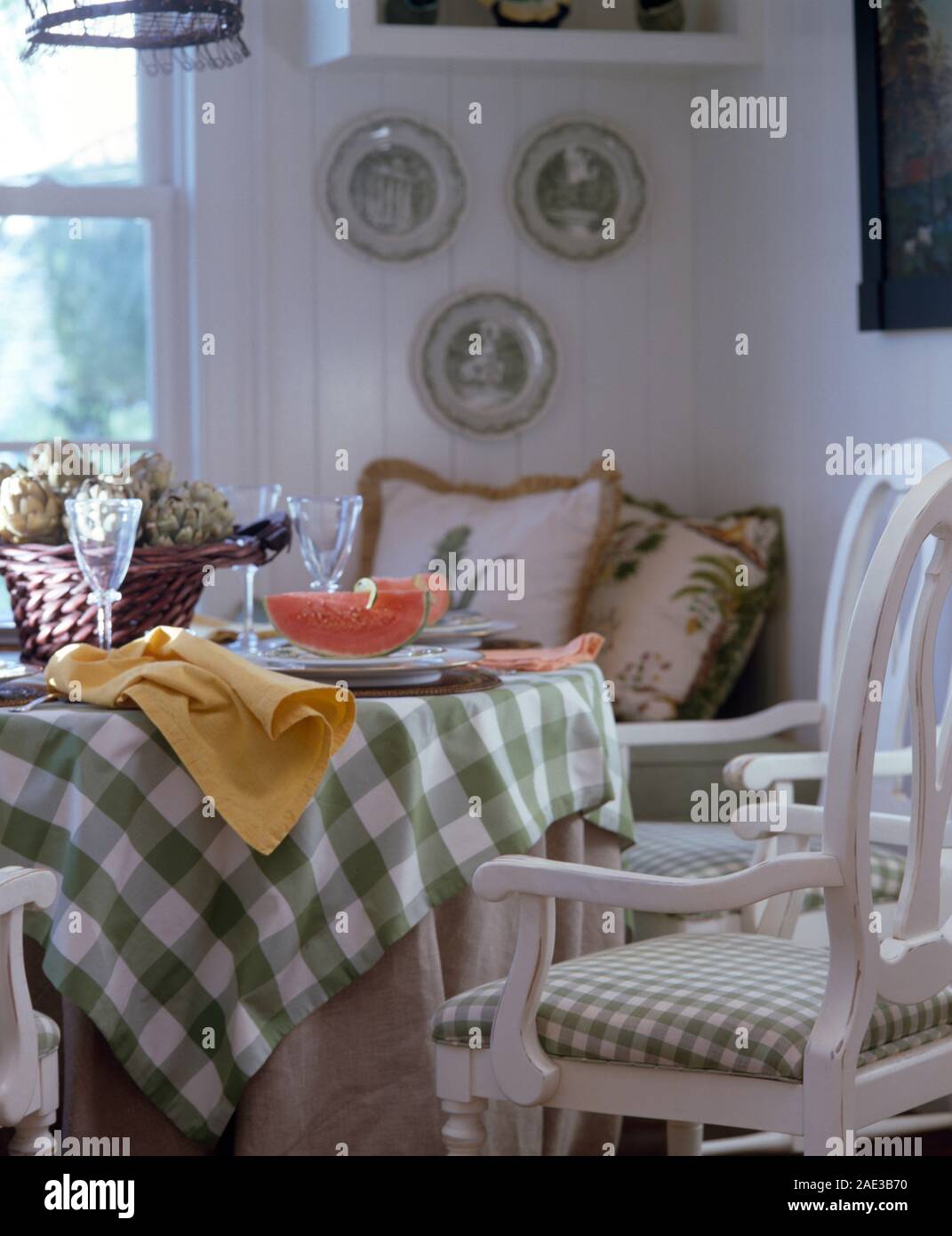 Checked Cloth On Table In Modern Country Dining Room Stock Photo