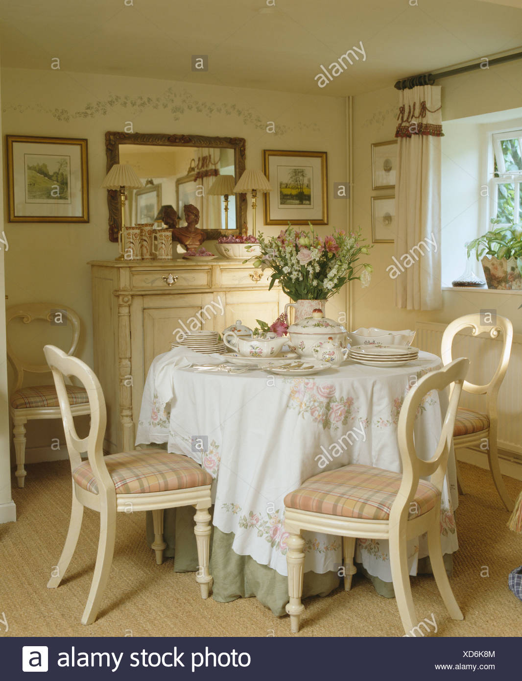 Cream Chairs With Checked Upholstered Seats At Circular Table With