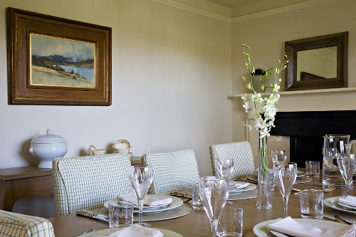 Checked Loose Covers On Chairs At Table Set For Dinner In Country