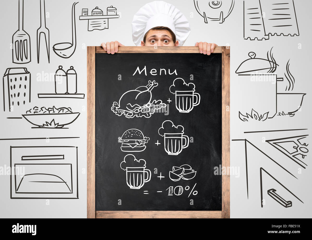 Restaurant Chef Hiding Behind A Big Chalkboard For A Business