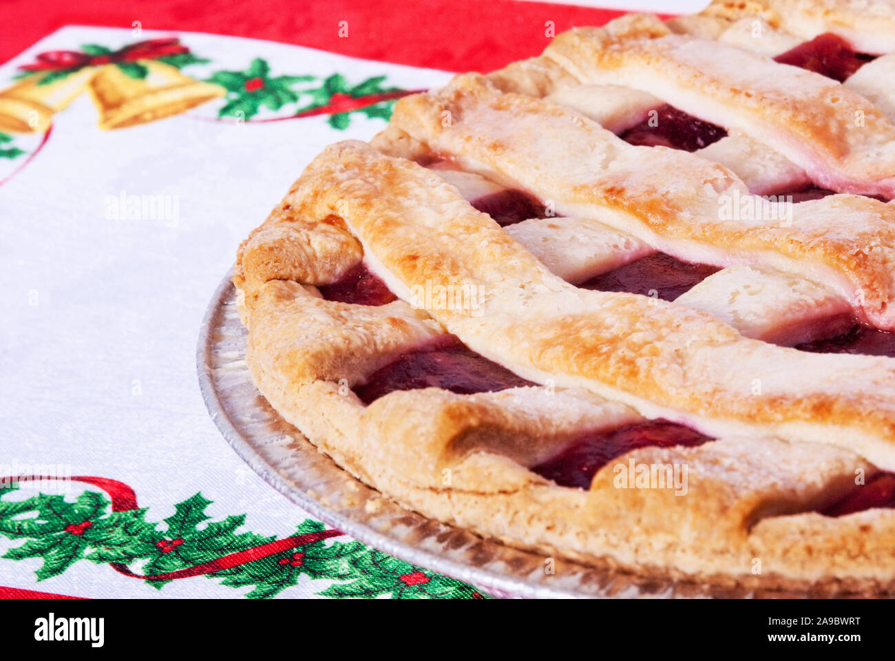 Homemade Lattice Pastry Crust Cherry Pie Served In An Aluminum Pie Plate It Is Served On A Christmas Holiday Place