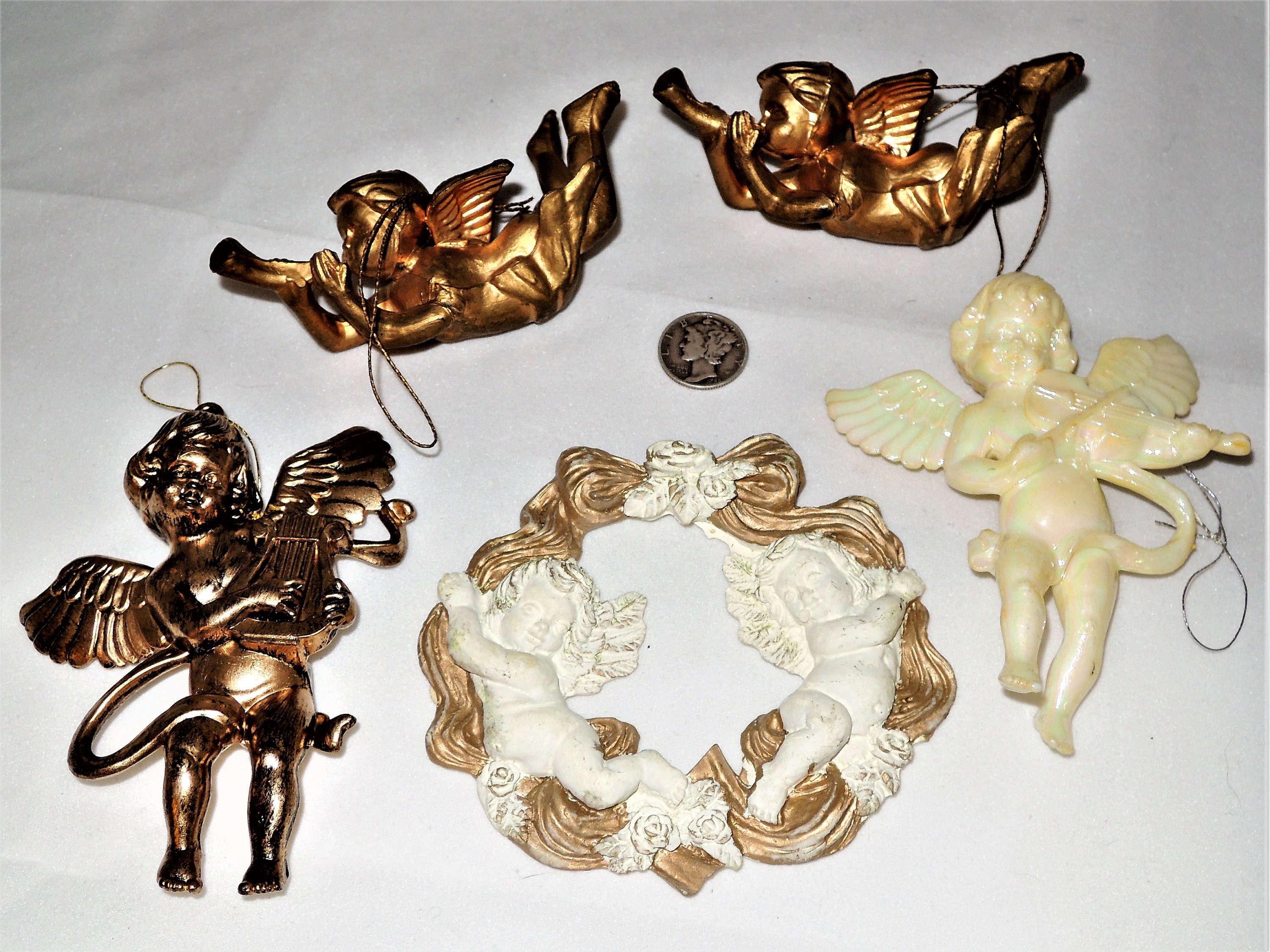 Angel Cherub Christmas Ornaments Hard Plastic Gold Color Lot Of