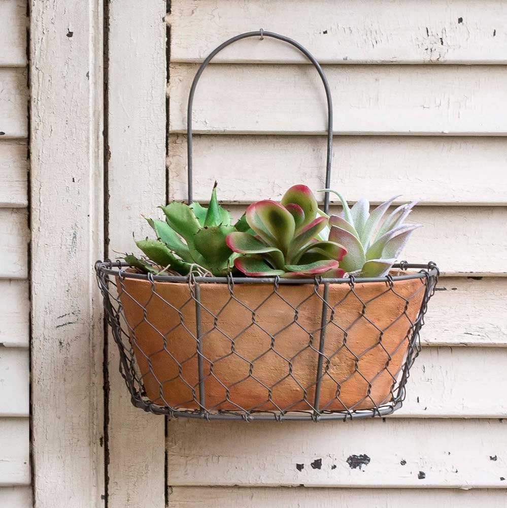 Rustic Metal Chicken Wire Wall Planter With Terra Cotta Pot
