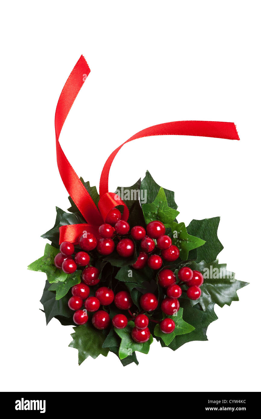 Christmas Berries Garland With Red Ribbon Isolated On White Stock
