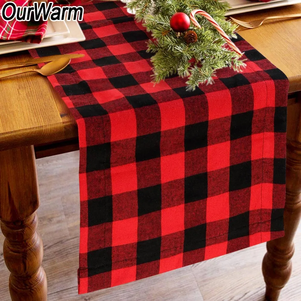 Ourwarm Buffalo Plaid Burlap Table Runner Christmas Red