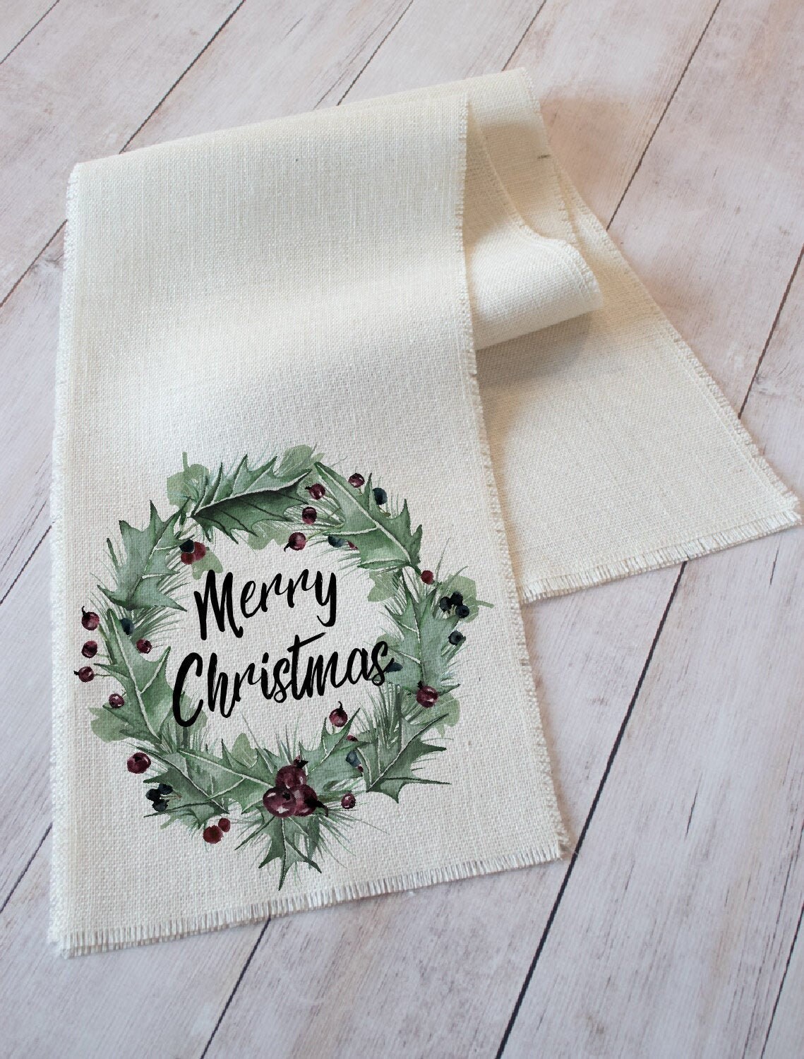 Merry Christmas Holly Wreath Cream Burlap Table Runner