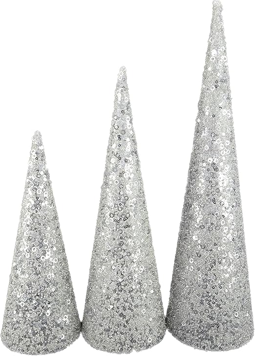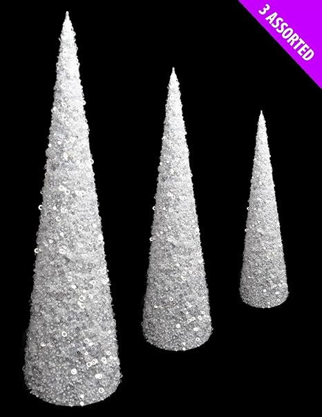 Pack Of 3 Various Size White Silver Glitter Pearl Bead Cone
