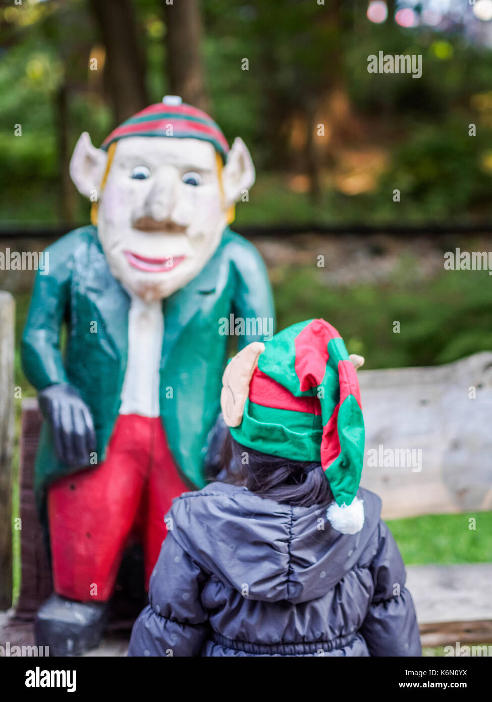 A Child Wearing Christmas Hat Viewing Christmas Elf Statue As Seen