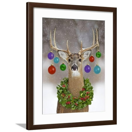 White Tailed Deer Buck In Winter Snow With Christmas Framed Print