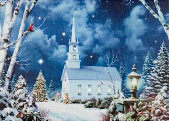 Lighted Church Scene With Colorful Rice Lights Lighted Canvas Art