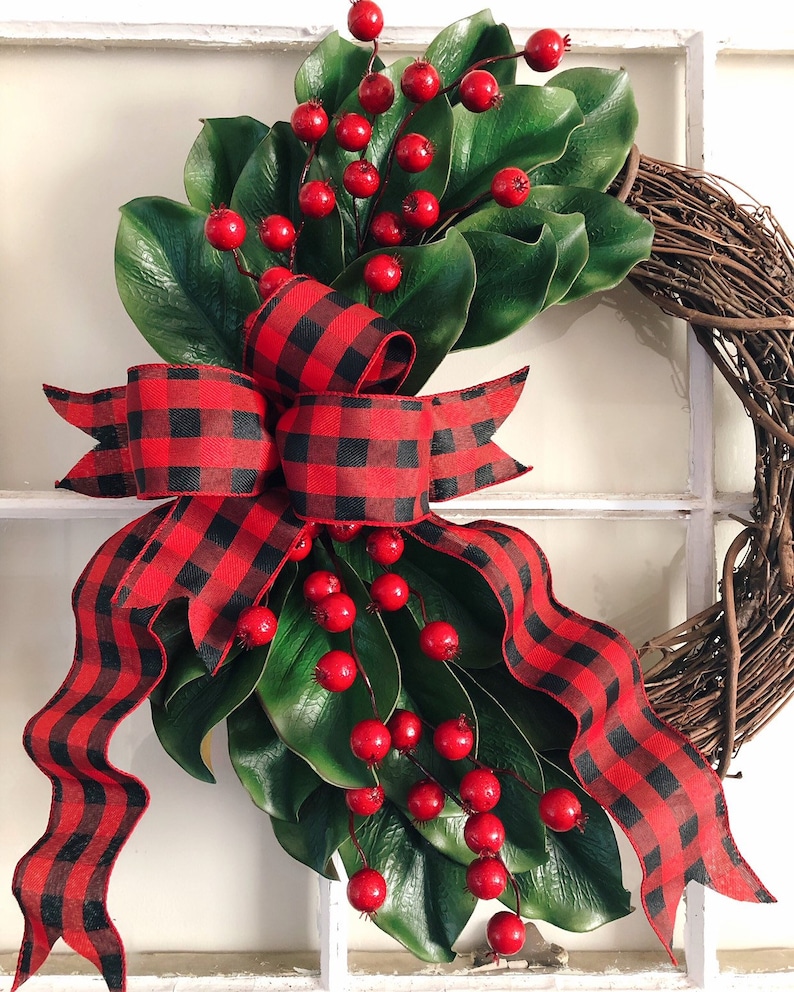 Winter Magnolia Wreath Christmas Buffalo Plaid Christmas