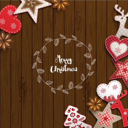 Christmas Background Small Scandinavian Styled Red Decorations Lying On White Wooden Desk Inspired By Flat Lay Style With Text Merry Christmas Framed By Abstract Leaf Wreath Vector Illustration Royalty Free Vector Graphics