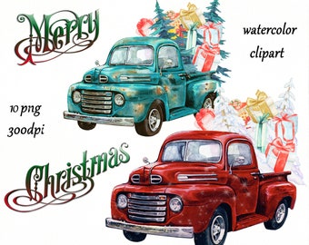 Christmas Clipart Watercolor Vintage Red Truck Christmas Tree Etsy