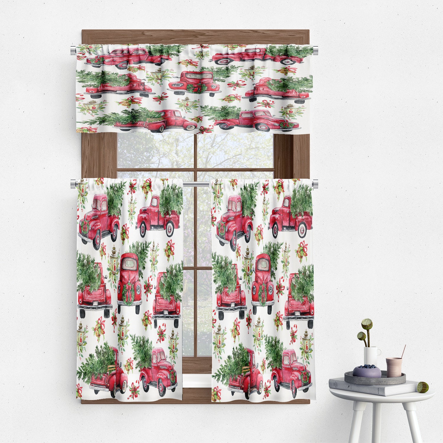 Christmas Window Valance Curtain Panel Red Truck With Christmas Tree