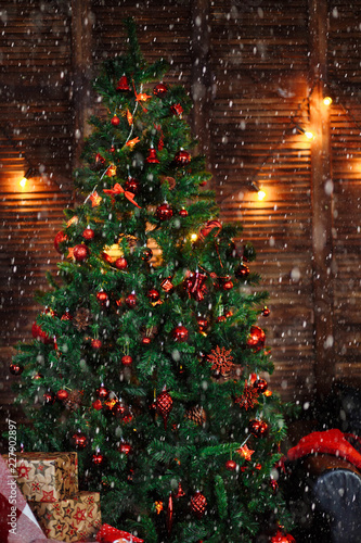 A Christmas Tree Decorated With Toys Ornaments Beads Red Garland On The Wooden Brown Wall In The Dark Sofa With Pillows Stock Photo Image Of Celebration Merry 128819904