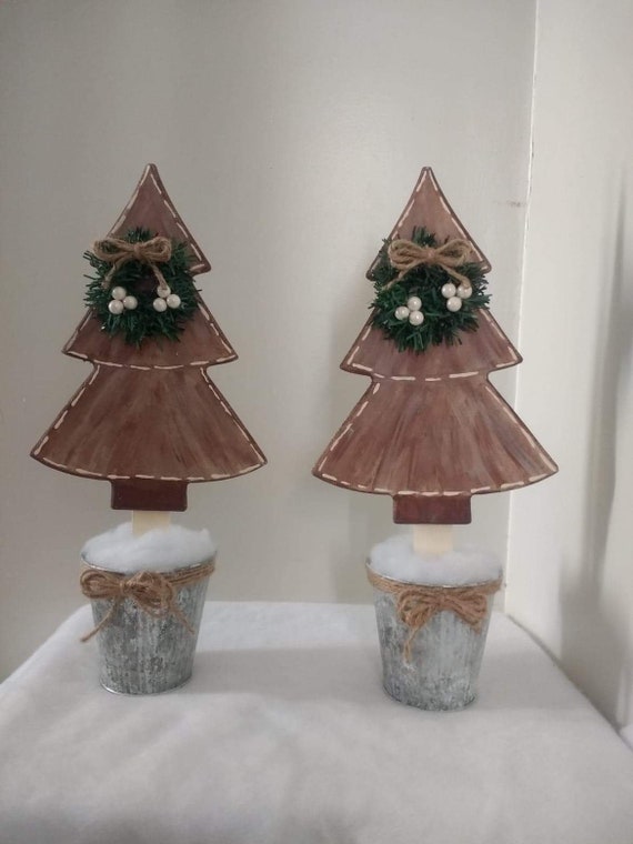 Two Decorative Wooden Trees In Tin Bucket Base Etsy