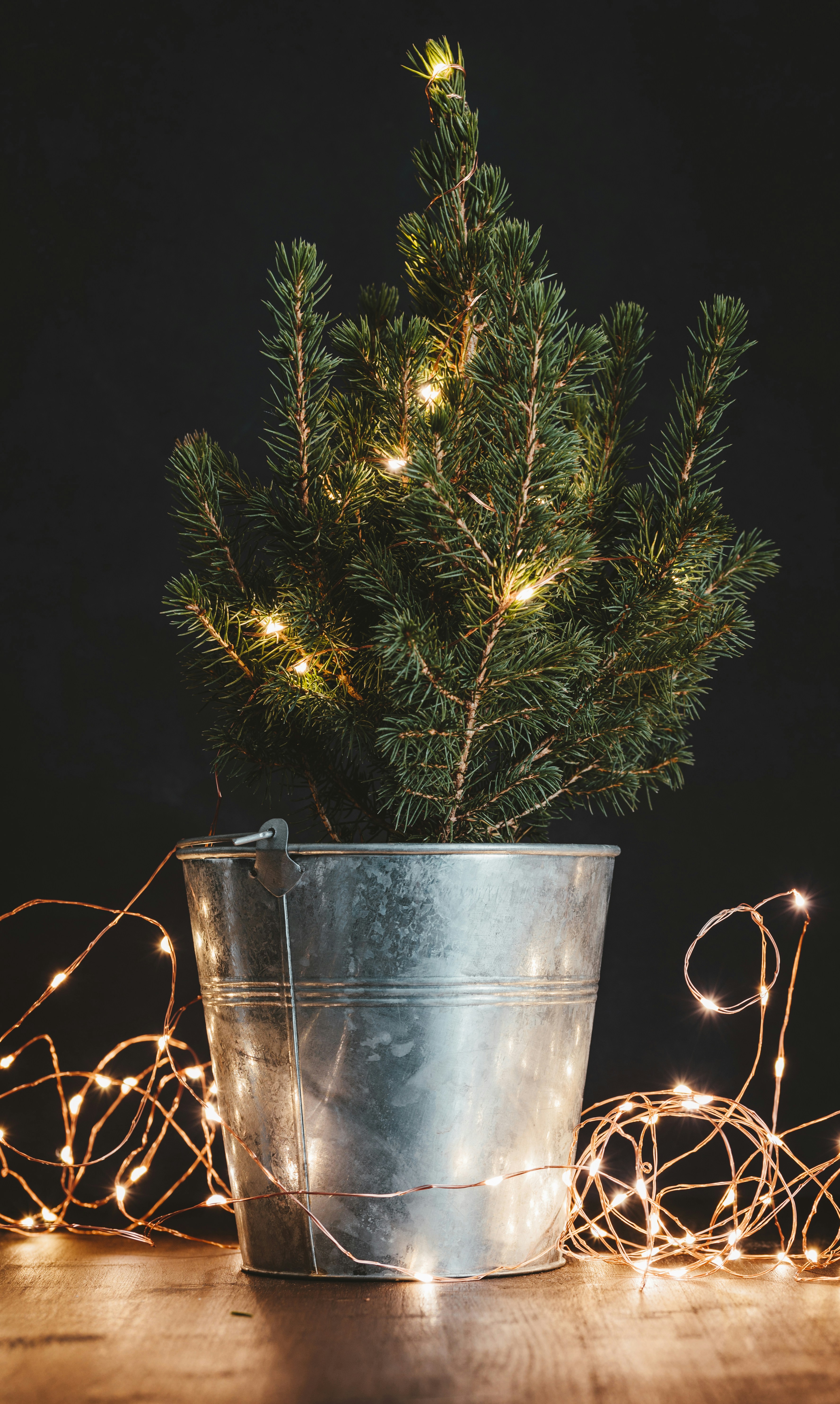 Green Christmas Tree In Bucket With String Lights Photo Free