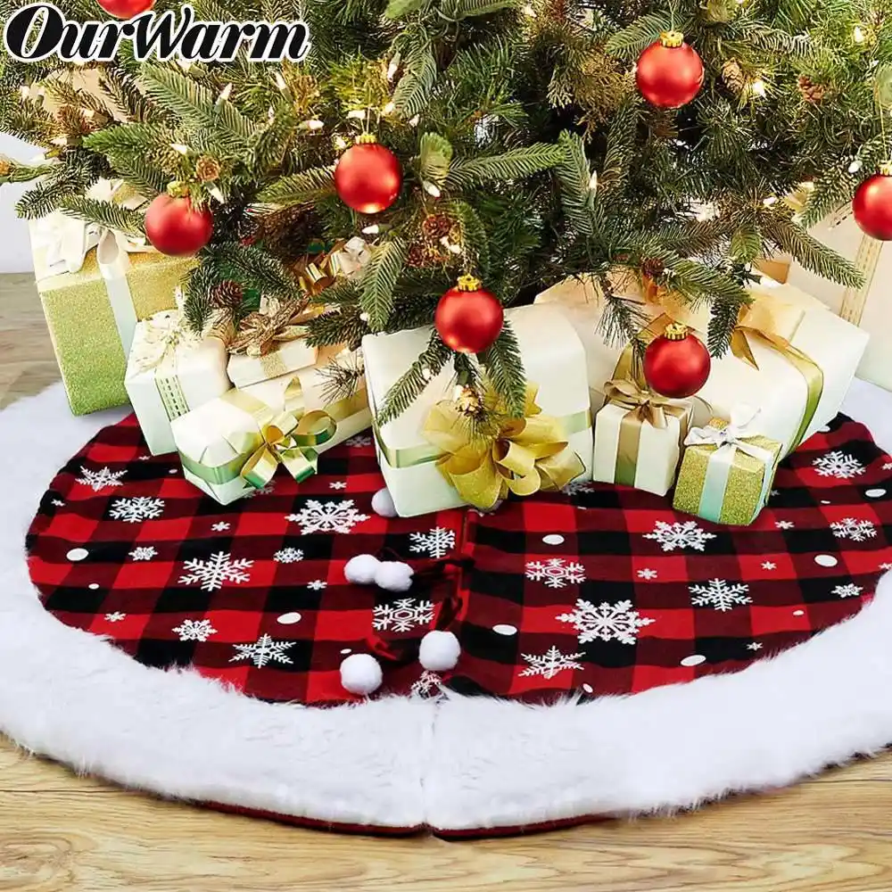 Ourwarm 122cm Buffalo Plaid Christmas Tree Skirt White Snowflakes