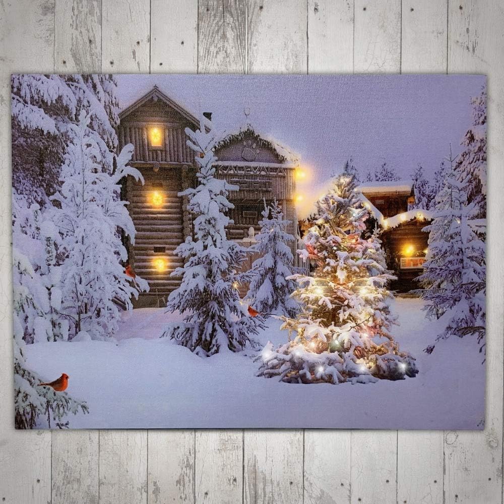 Banberry Designs Lighted Christmas Wall Art 12 X 16 Canvas Print With Cabins Cardinals And Trees In An Outside Winter Scene Winter Picture With Led Lights Buy Online In
