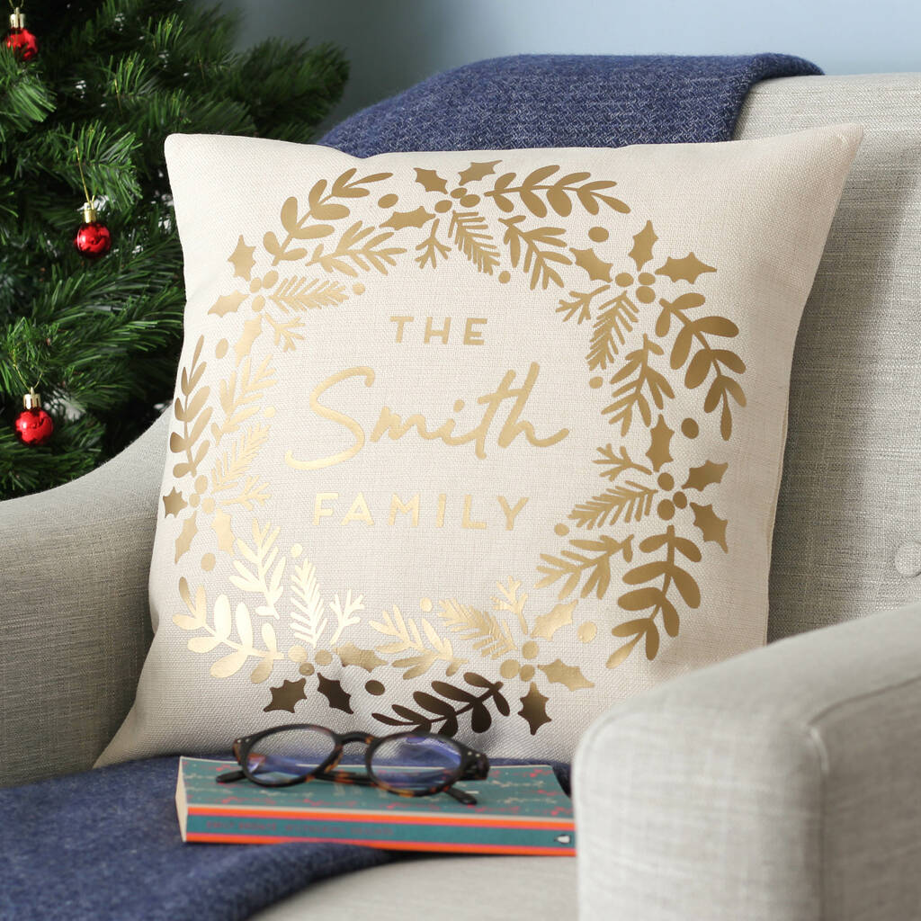 Personalised Metallic Gold Christmas Wreath Cushion By That S Nice