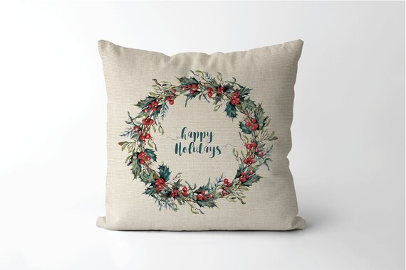 Happy Holidays Holly Berry Wreath Pillow Christmas Pillow Etsy