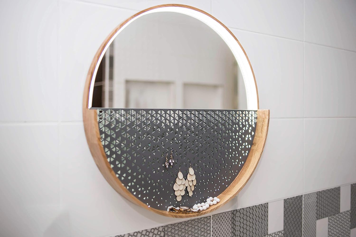 Amazon Com Ewart Woods Mirror With Lights Round Decorative Wall Mirror Wood Circle Mirror Wall Mirror With Controllable Light Brightness Jewelry Organizer Grey