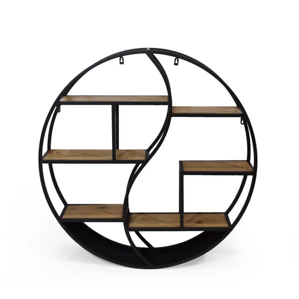 Black Metal Circle Round Wall Unit With Wooden Shelves Industrial