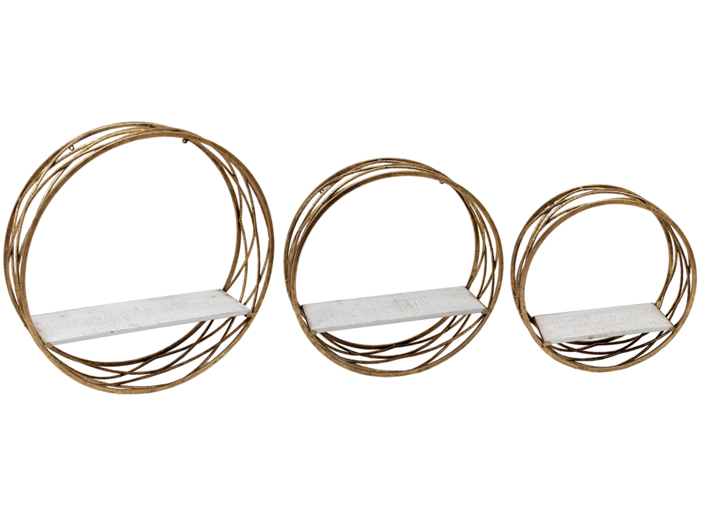 Set Of 3 Gold Metal With White Wood Round Wall Shelves 6x24