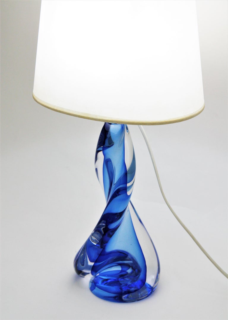 Pair Of 1950s Belgium Val St Lambert Blue Glass Table Lamps