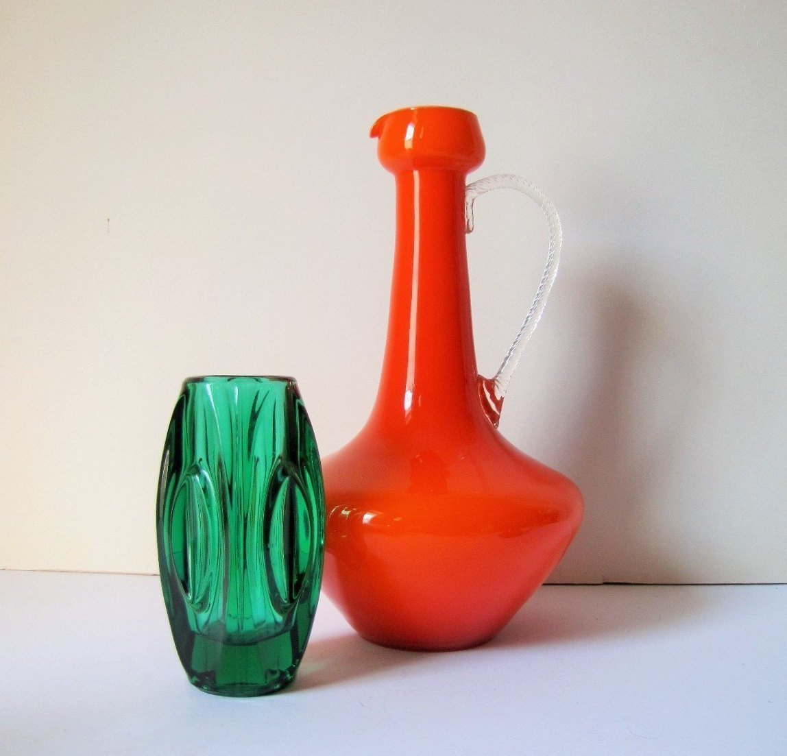 Mid Century Green Glass Jug Vase With Handle Blue Green Etsy