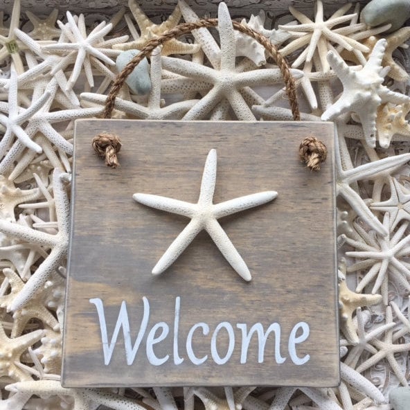 Hand Painted Welcome Sign With Starfish And Roping Coastal Beach