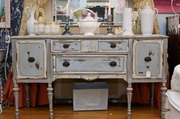 Antique Mahogany Buffet Server In Swedish Blue Distressed Beach