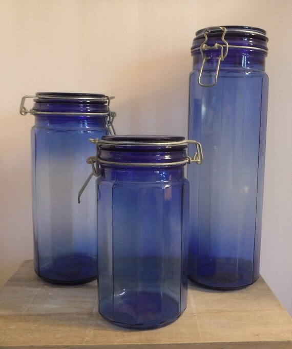 80s 90s Vintage Cobalt Blue Glass Kitchen Canisters Tall French