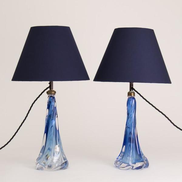 Pair Of 1950s Belgium Val St Lambert Blue Glass Table Lamps
